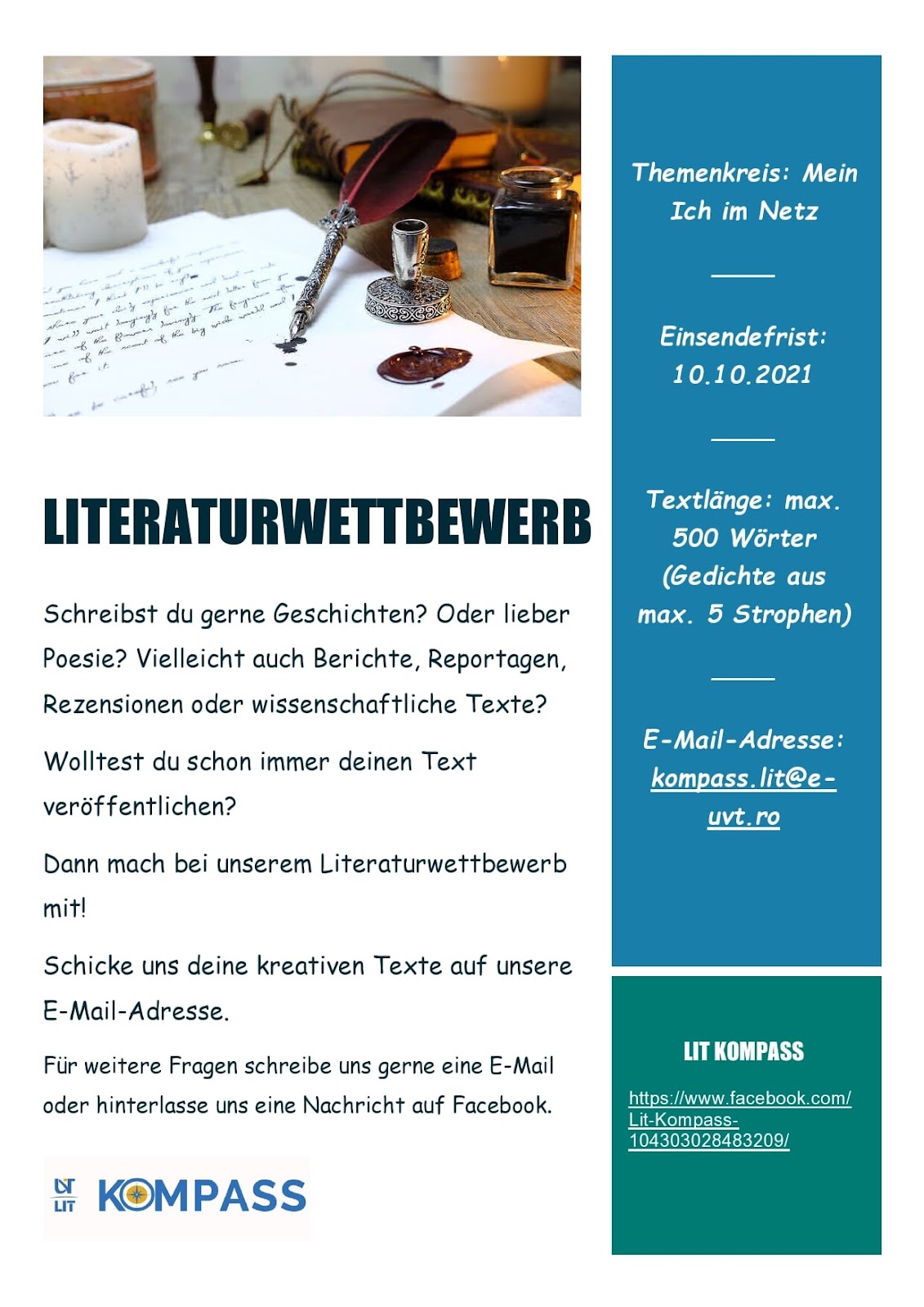 Heyo! Du hast die Chance deinen Text zu veröffentlichen und deine Ideen bekannt zu machen. Mach bei unserem Literaturwettbewerb mit und schicke uns deine kreativen Texte! Nu rata ?ansa de a-?i publica textul ?i a-?i face ideile cunoscute. Particip? la concursul nostru de crea?ii literare ?i trimite-ne textele tale creative pân? în 10 octombrie. Aktualisierung: Nun ist das Warten vorbei! Unser Team freut sich darüber, die Gewinner des Schreibwettbewerbs zum Thema "Mein Ich im Netz" bekanntzugeben : Schüler- Prosa: Briana Herciu, 11.Klasse, Nikolaus Lenau Lyzeum Erwachsene- Prosa: Vanessa Cu?ui Erwachsene- Dichtung: Dragana Paulic Herzlichen Glückwunsch an alle!
