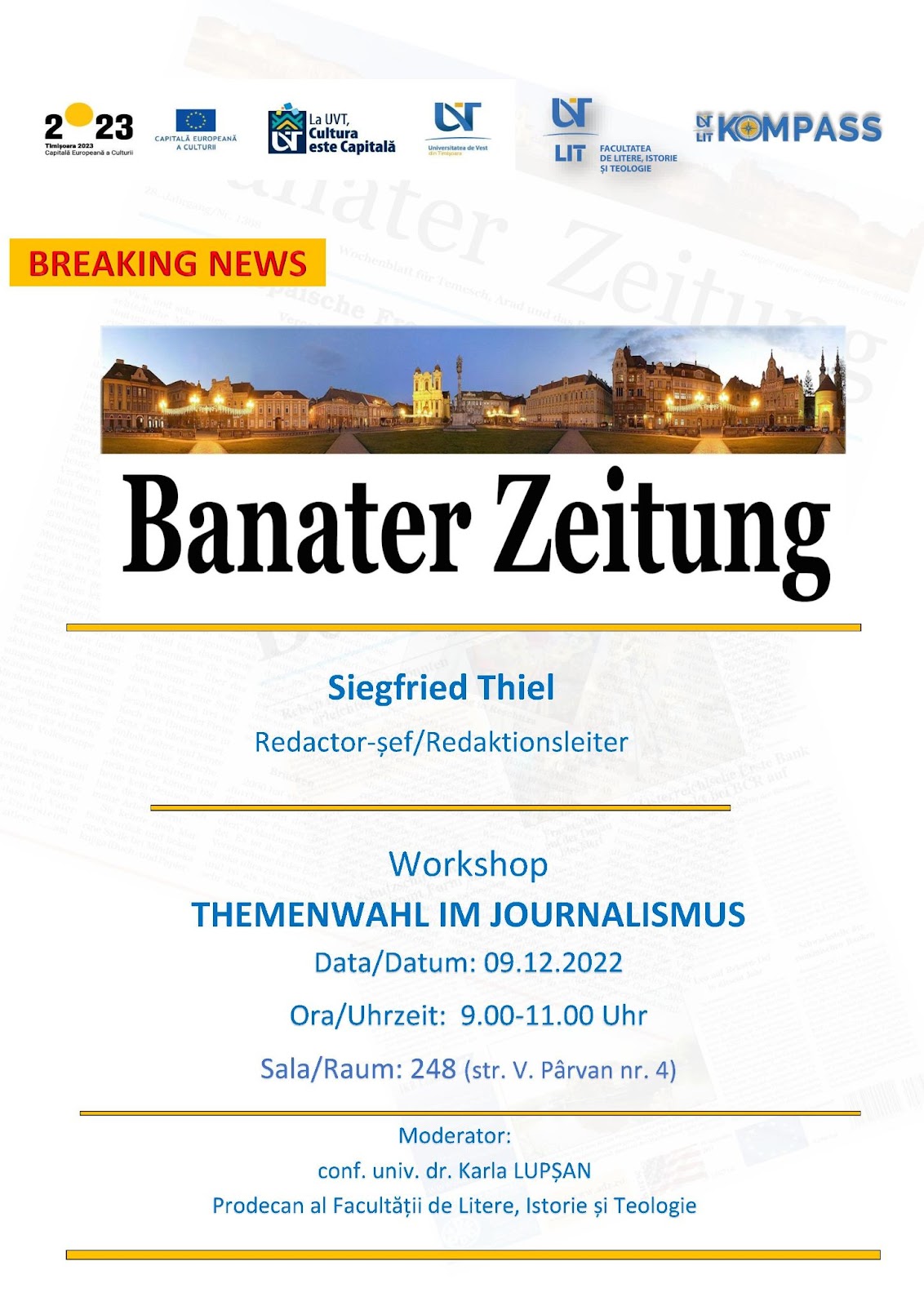 Von den Besten lernen: Nutzen Sie die Gelegenheit, beim Präsenz-Workshop ?Themenwahl im Journalismus", unter der Leitung von Herrn Siegfried Thiel, Redaktionsleiter der ?Banater Zeitung" Ihr praktisches Wissen zu festigen und zu erweitern. Wir freuen uns, Sie am 9. Dezember 2022, von 9.00 bis 11.00 Uhr, an der West-Universität Temeswar (V. Pârvanstr. 4), im Raum 248, begrüßen zu dürfen.